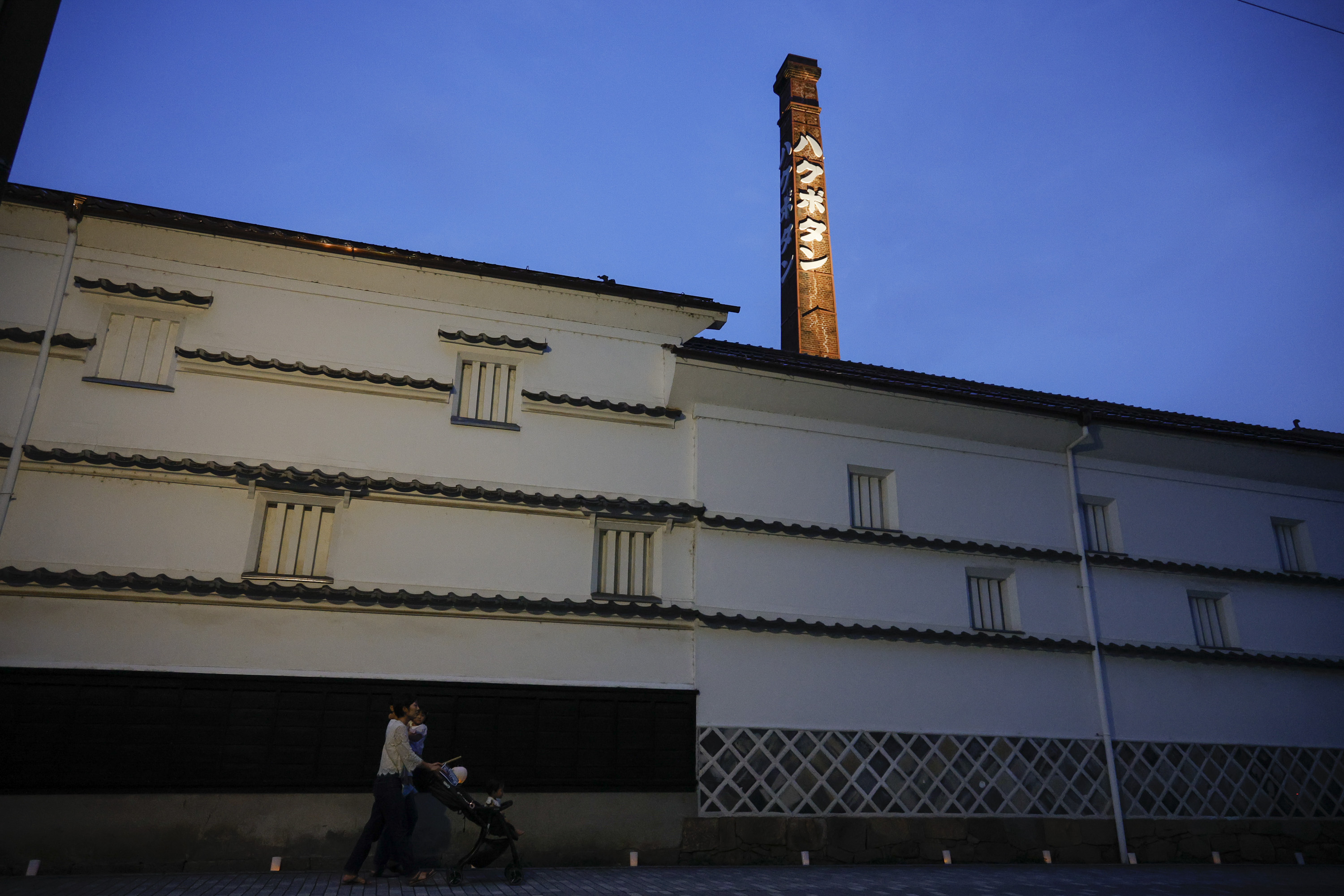 The chimneys and white walls of the sake breweries on Saijo Sakagura-dori Street will be illuminated from Saturday, September 13 to Tuesday, September 23, 2025.