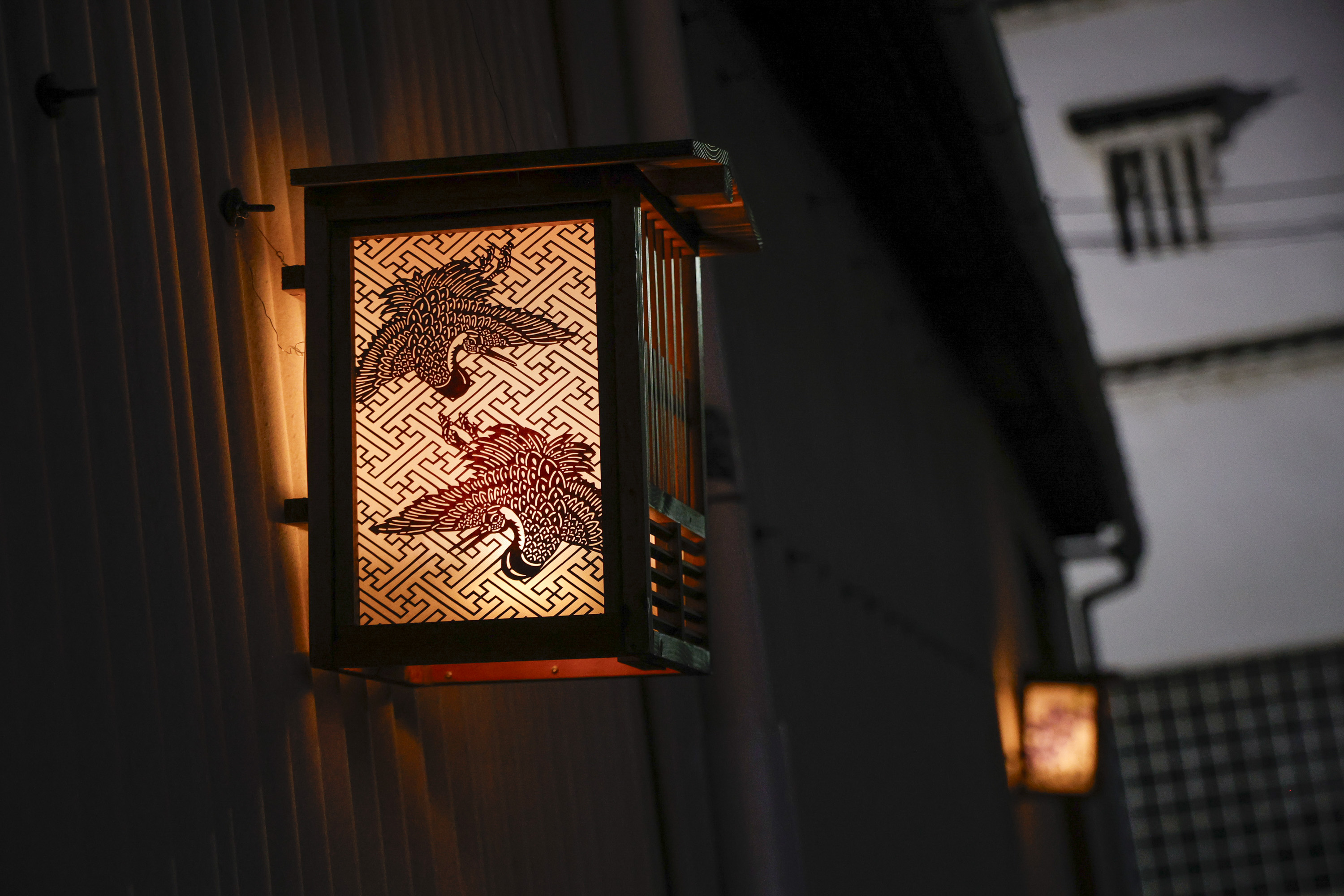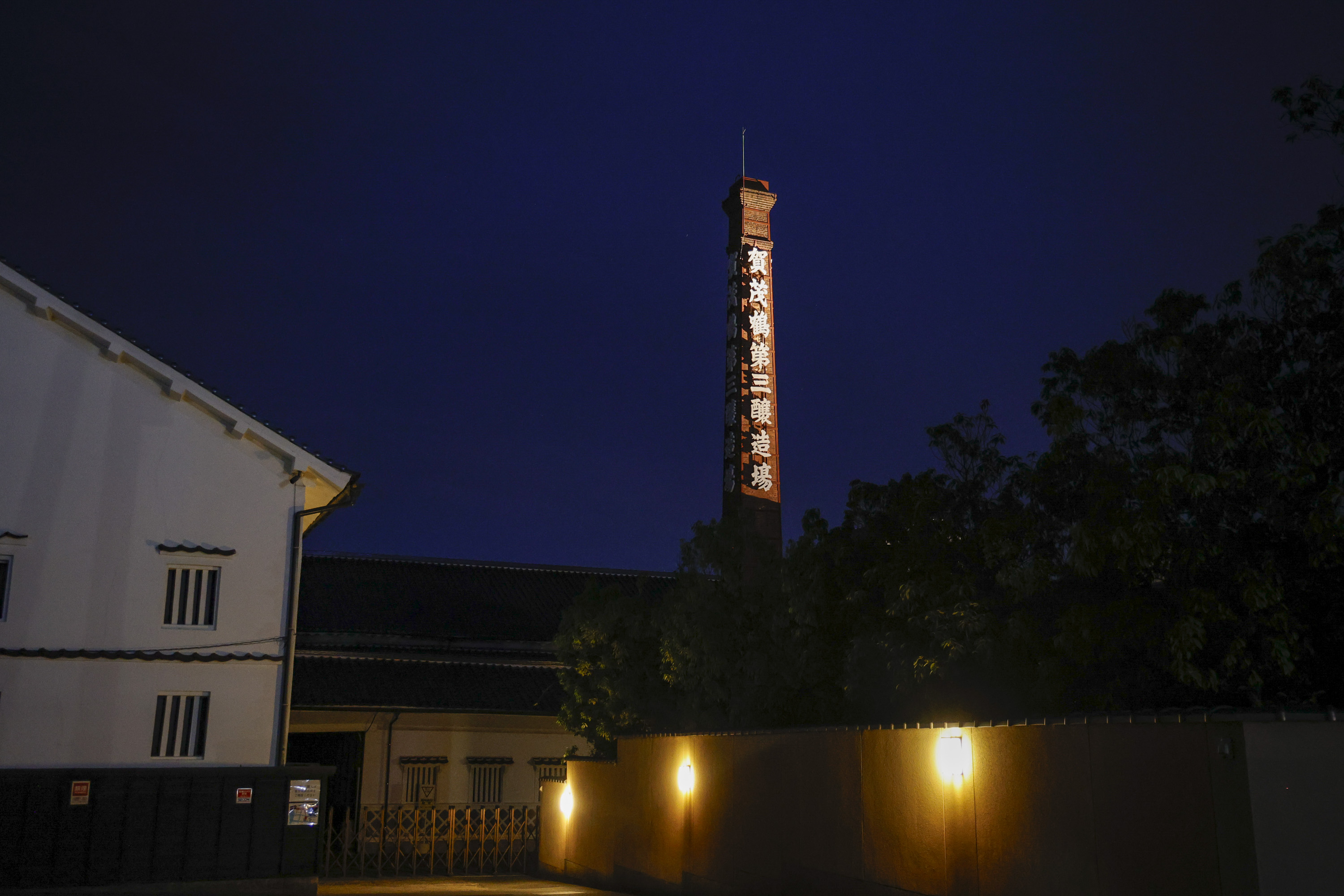 ■ Nighttime lights on the chimneys and white walls of Sakagura-dori Street