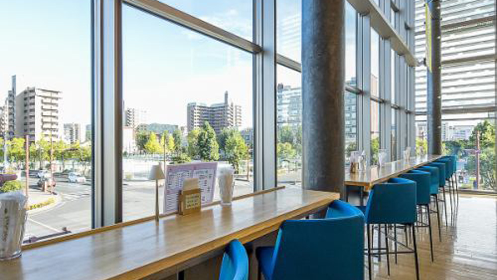 Only a 7-minute walk from JR Saijo Station, this café is located on the second floor of the Higashihiroshima Art & Culture Hall “Kurara”.