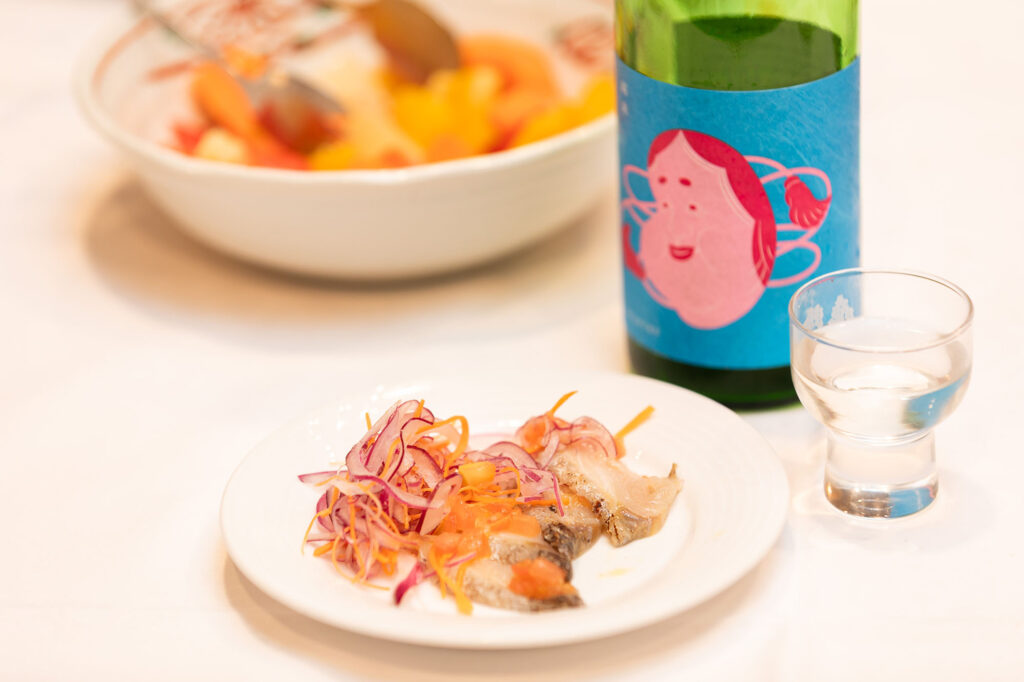 On the other hand, “Kyudaime Otafuku Junmai” by Tsuka Shuzo was paired with “Seared Kan-sawara and aromatic vegetables.” The lightly seared fatty Sawara and the slightly bitter aromatic vegetables were in perfect harmony with the refreshing dry sake. With each sip, the flavored profile became more distinct.